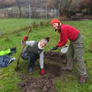 Later in the month, we had a weekend workcamp in Slatinka, it was such an amazing time in nature! We planted trees, picked up plastic flowers from the cemetery, dug holes, and cut wood. I really enjoyed being outside, off the grid, and reconnecting with what’s essential in life: staying warm, doing meaningful work, eating good food, and being with nice people. I also had fun playing card games with another volunteer, Oleg. And Maria was a great leader!