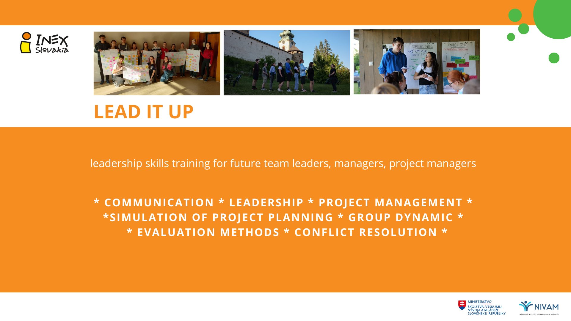 • participation fee =70,-EUR (The fee helps us cover a small part of the event costs. The costs of organizing the event include accommodation, meals, refreshments, seminar room fees, and event materials. At the same time, the contribution represents an expression of interest in participating in the event. The training team prepares the training on the voluntary basis. You can pay the contribution to our account SK9683300000002003337134 (the account is held at FIO bank under the name INEX Slovakia – občianske združenie), please include your name and surname and Lead It Up in the note.